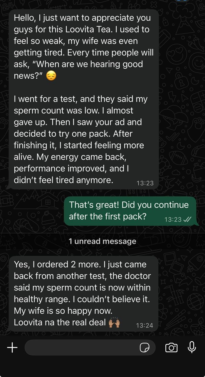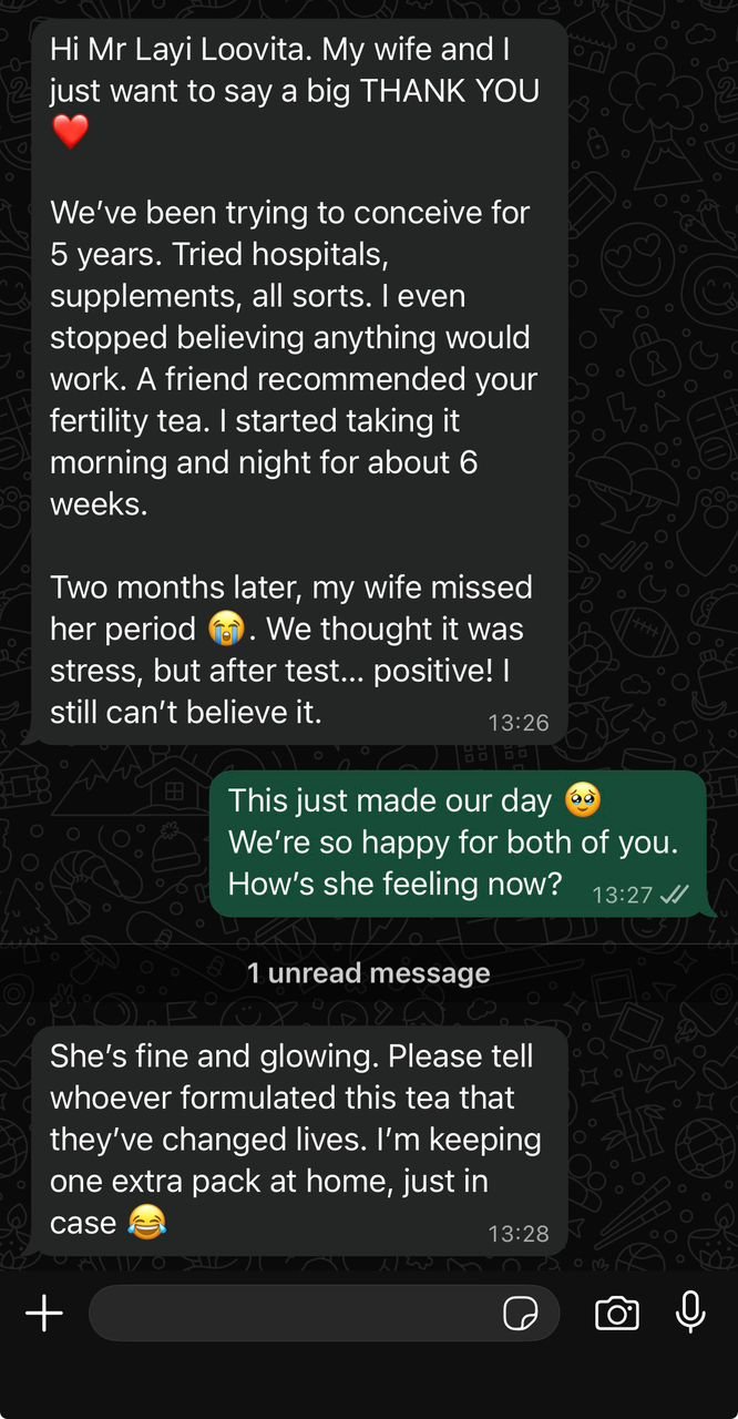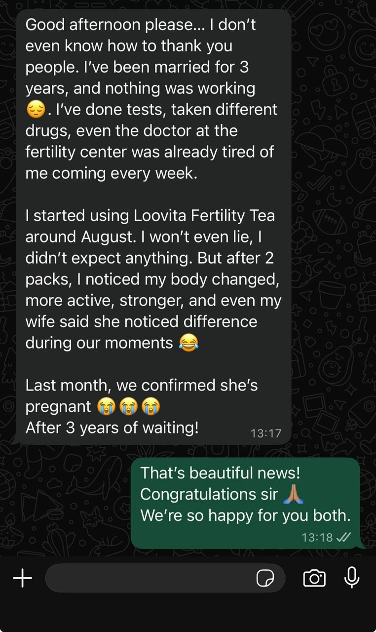 “Omo, I don try everything. I even go hospital tire, doctors sef don tire for me. Dem no fit see wetin dey cause am. My body just dey weak, energy don go, and we don dey try for months, nothing. Na when I start LooVita everything change. My energy come back, my drive rise again, and before two months, my babe don carry belle. This tea no be joke, e really work.”
